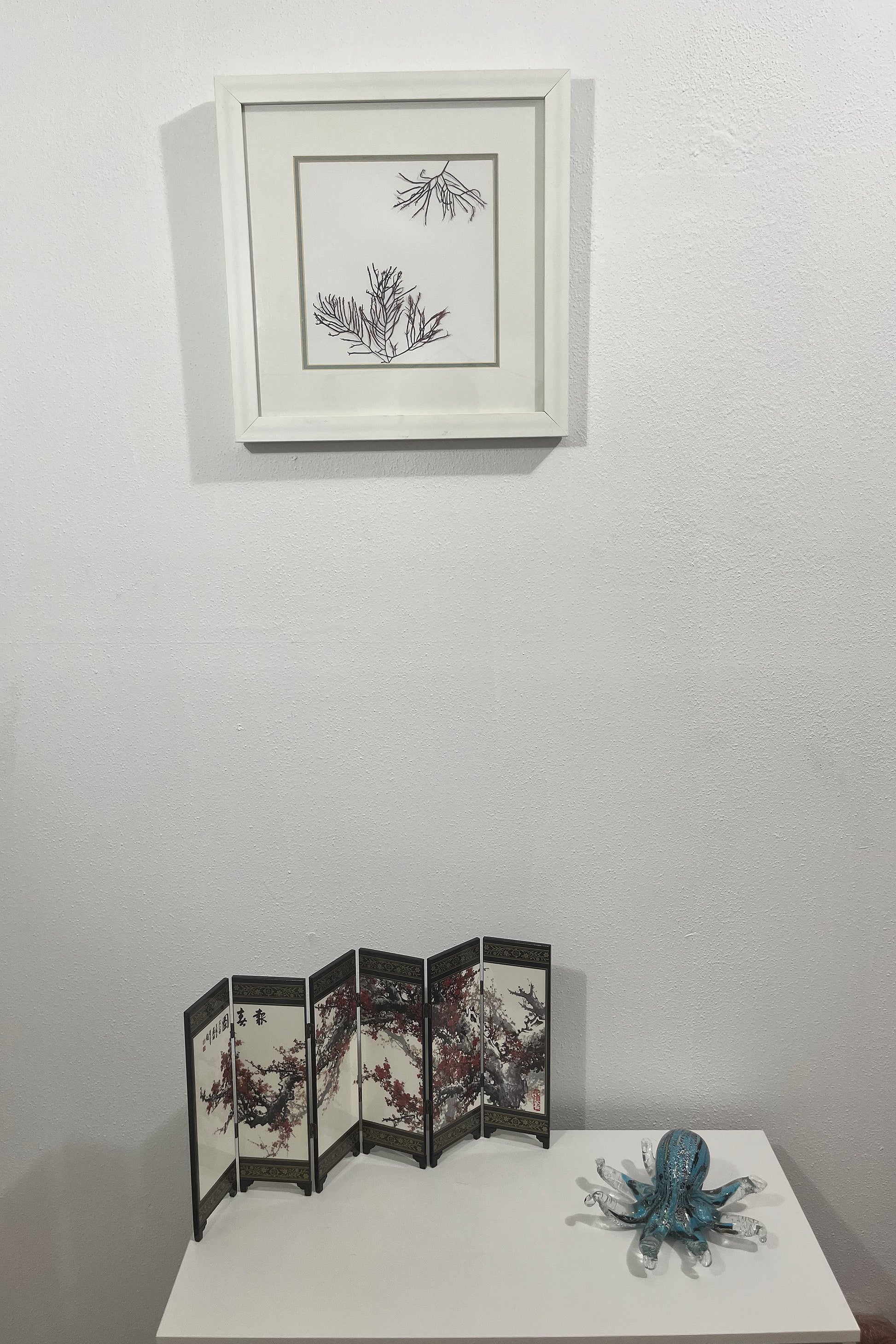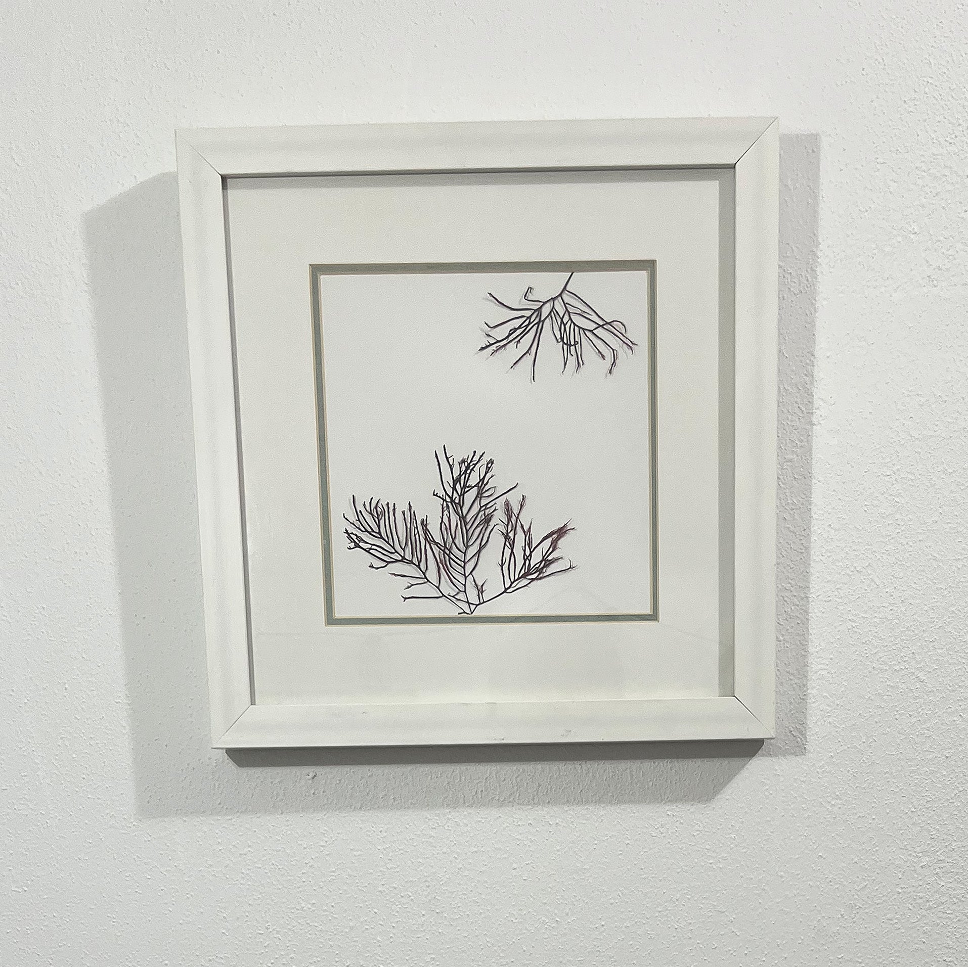 Looking to take home a little bit of the beach? This is the perfect piece for you. The white painted frame with subtle hints of dea blue features pink-tipped algae that is literally popping off the page. All framed within a mat outline in a beautiful sea blue-green, it'll bring the beach to you wherever you are. The entire frame measures 14 x 14 inches, with an 8 x 8 window and mat.