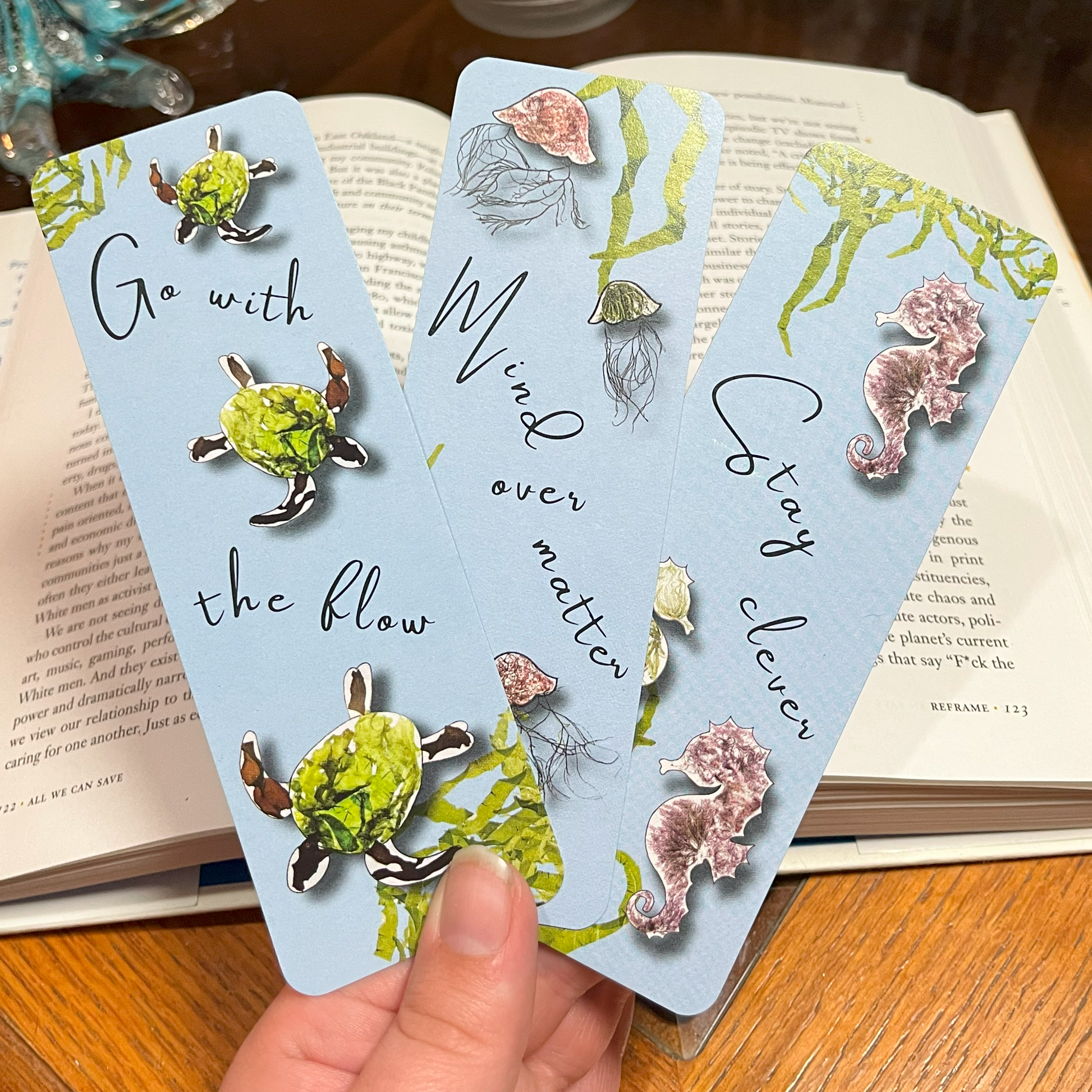 Can't decide on a bookmark design? Bundle to save and get one of each! This bookmark set is perfect for the reader in your life – whether that’s you or a loved one. The design is a reprint of my original artwork, created with algae hand-picked right from our waters along the northeast coastline. All color is 100% natural and unaltered.