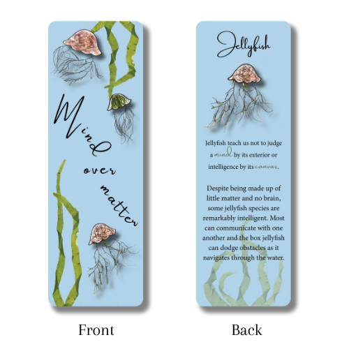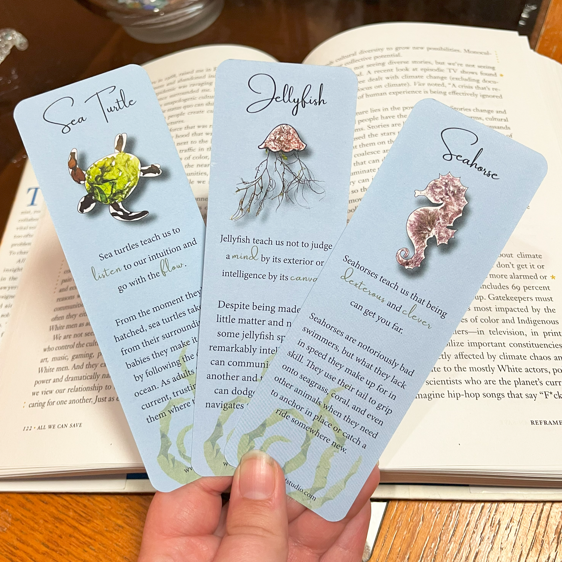 Every bookmark is 2x6 inches, double-sided, and printed on 100% recycled paper with soy-based ink. Bookmarks are not laminated, in order to eliminate plastic and maintain recyclability. All shipping is carbon neutral.