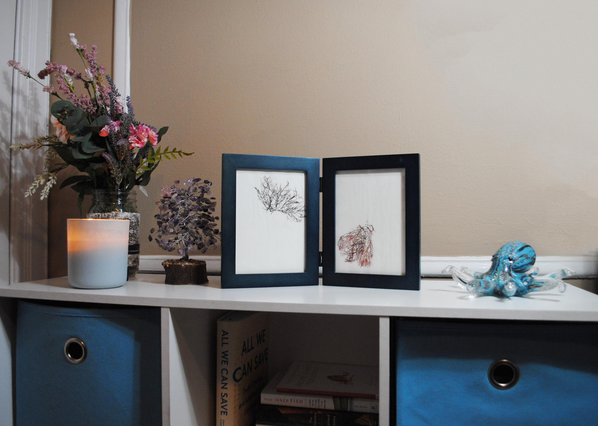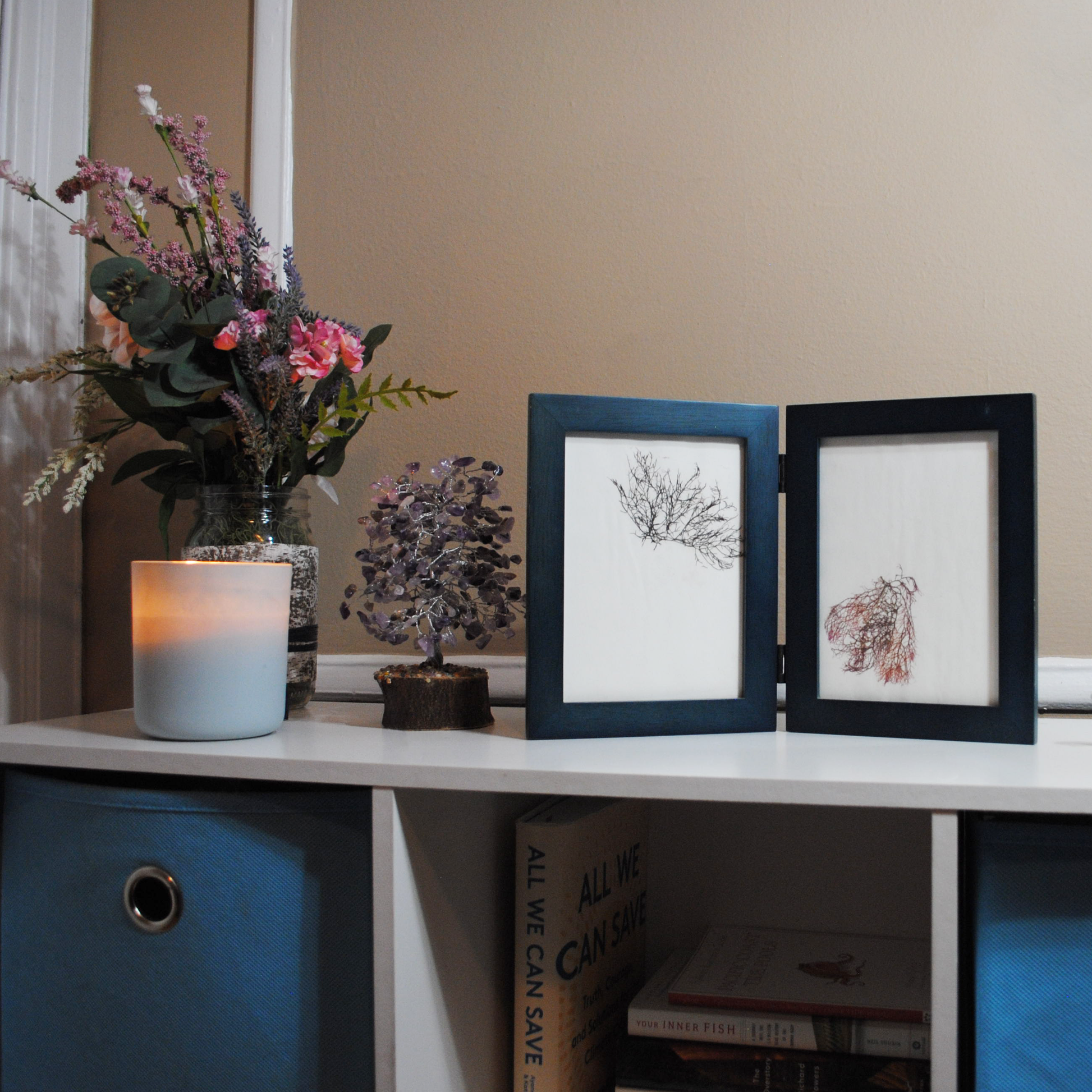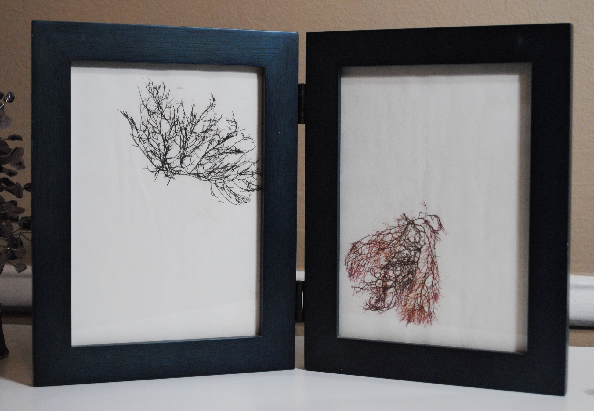Every design is created using algae that I hand-collect right from our coastline! All framed artwork are original pieces of the pressed algae itself preserved behind the glass. Tote bags, greeting cards, and stickers are re-prints of my original artwork. All color is 100% natural and unaltered.