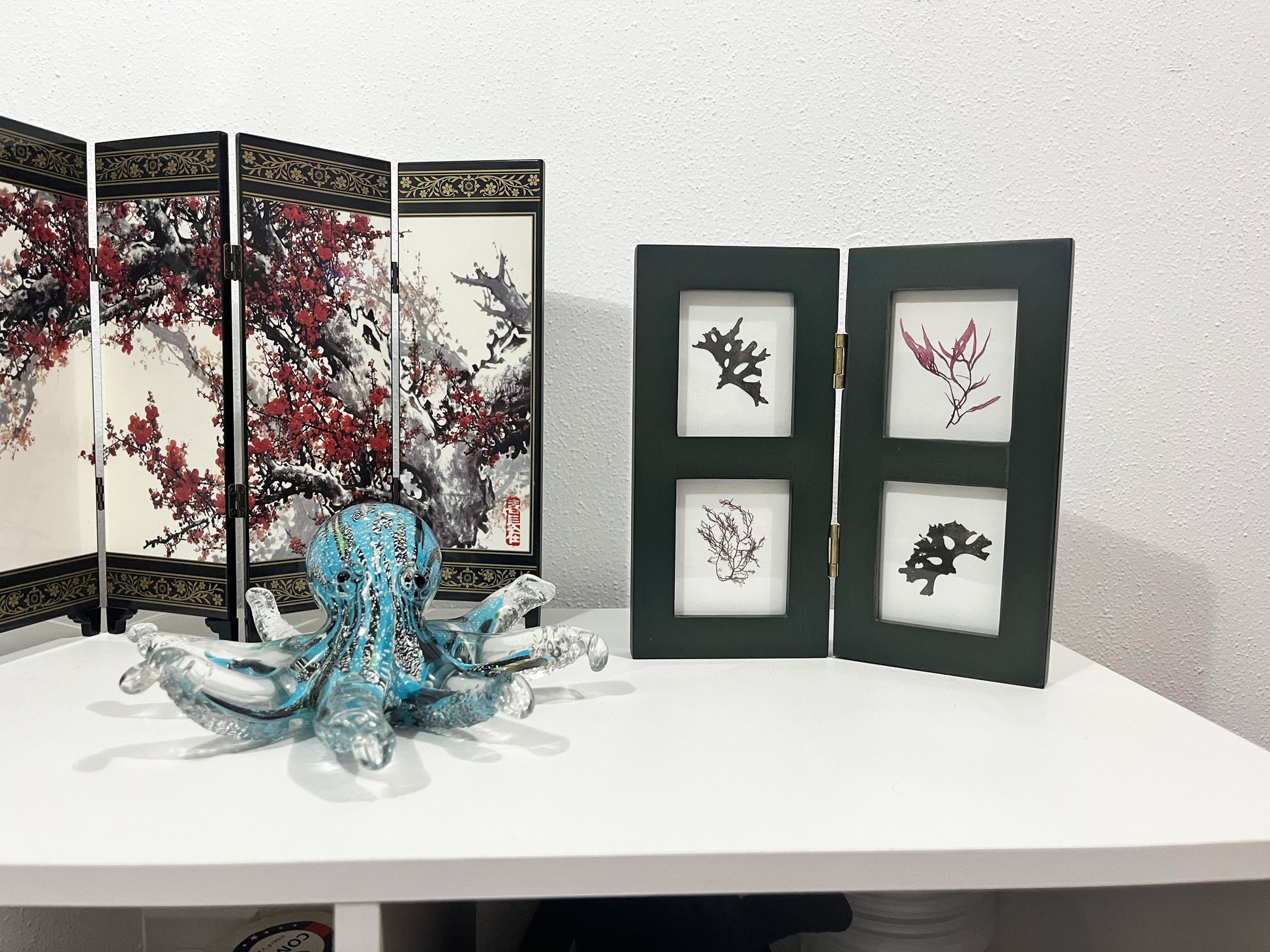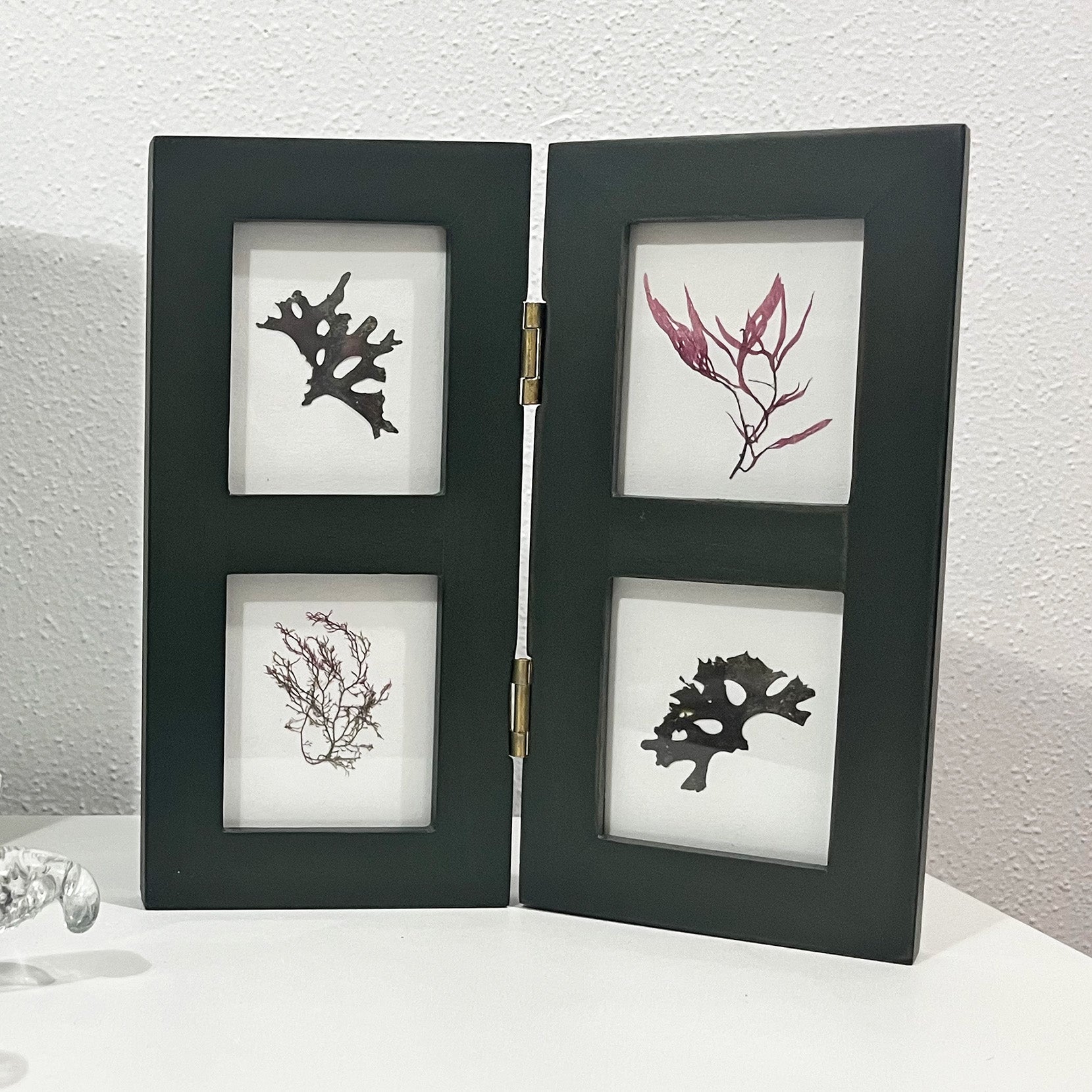 This dark green wood frame features four windows that each house a unique piece of algae in colors ranging from deep purple to bright pink. The perfect addition to any bookshelf! The entire frame measures 7.5 x 7.5 inches, with each window measuring 2.5 x 3 inches. Bonus: Since this one can fold to take up less space, shipping is significantly reduced compared with frames of a similar size!