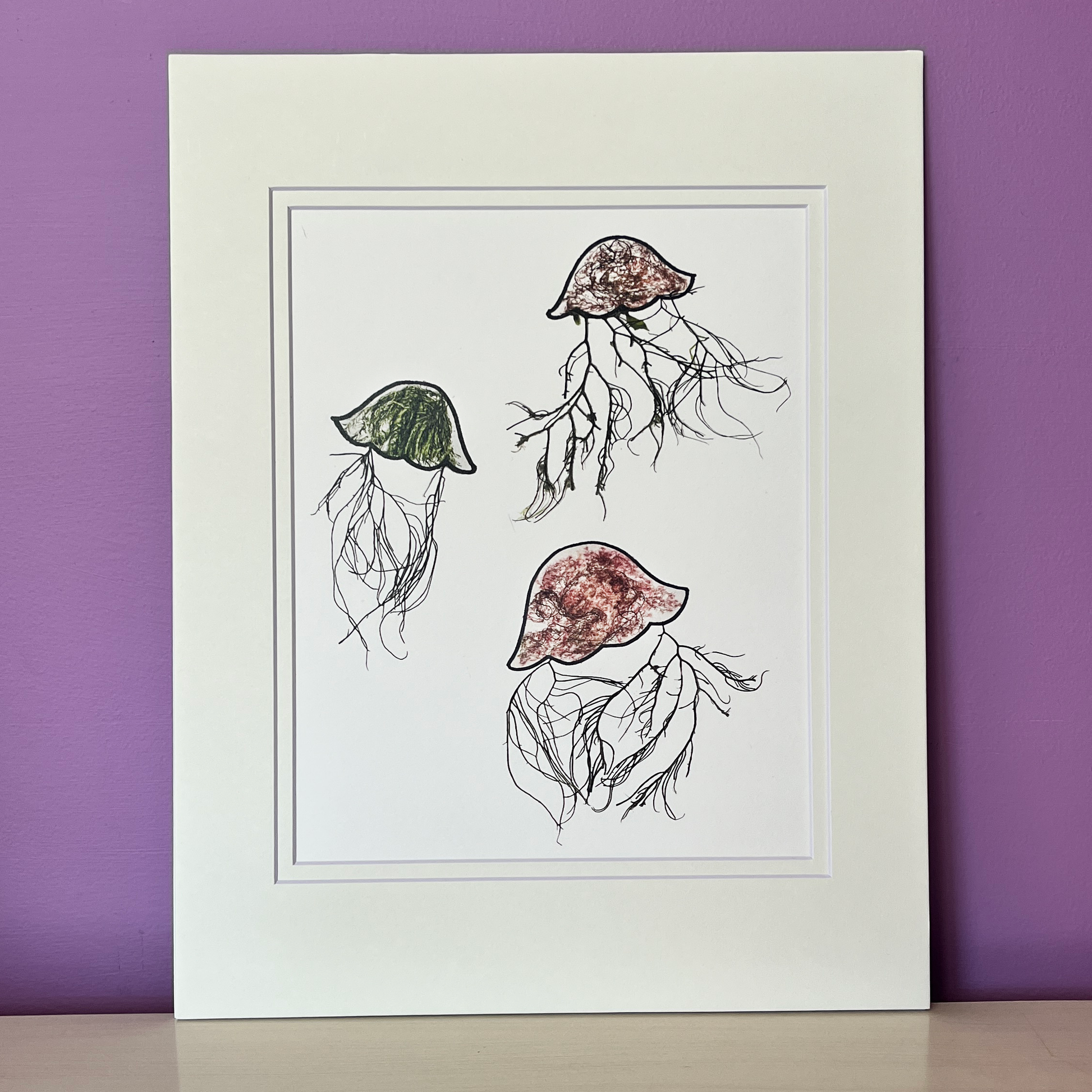 This beautiful jellyfish print showcases my original artwork, created with algae hand-picked right from our waters along the northeast coastline. All color is 100% natural and unaltered.