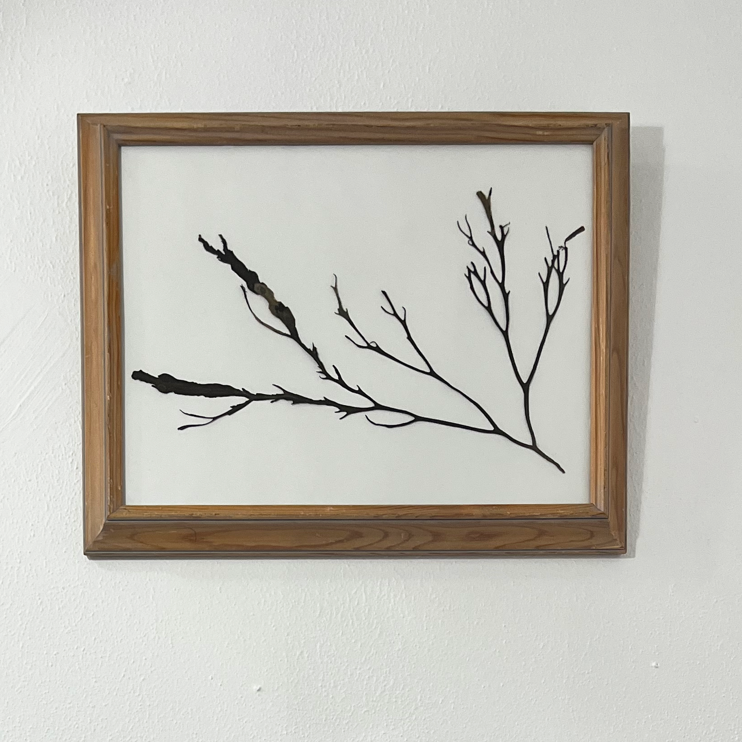 This minimalist branching algae is the perfect addition to any gallery wall or stand alone piece. Housed in a rough-finished wood frame with hints of light blue around the edges, every inch of it is more unique than the last. The textured algae adds a level of complexity that showcases how incredible even the simplest algae can be. Frame measures 14.5 x 18.5 inches in total.