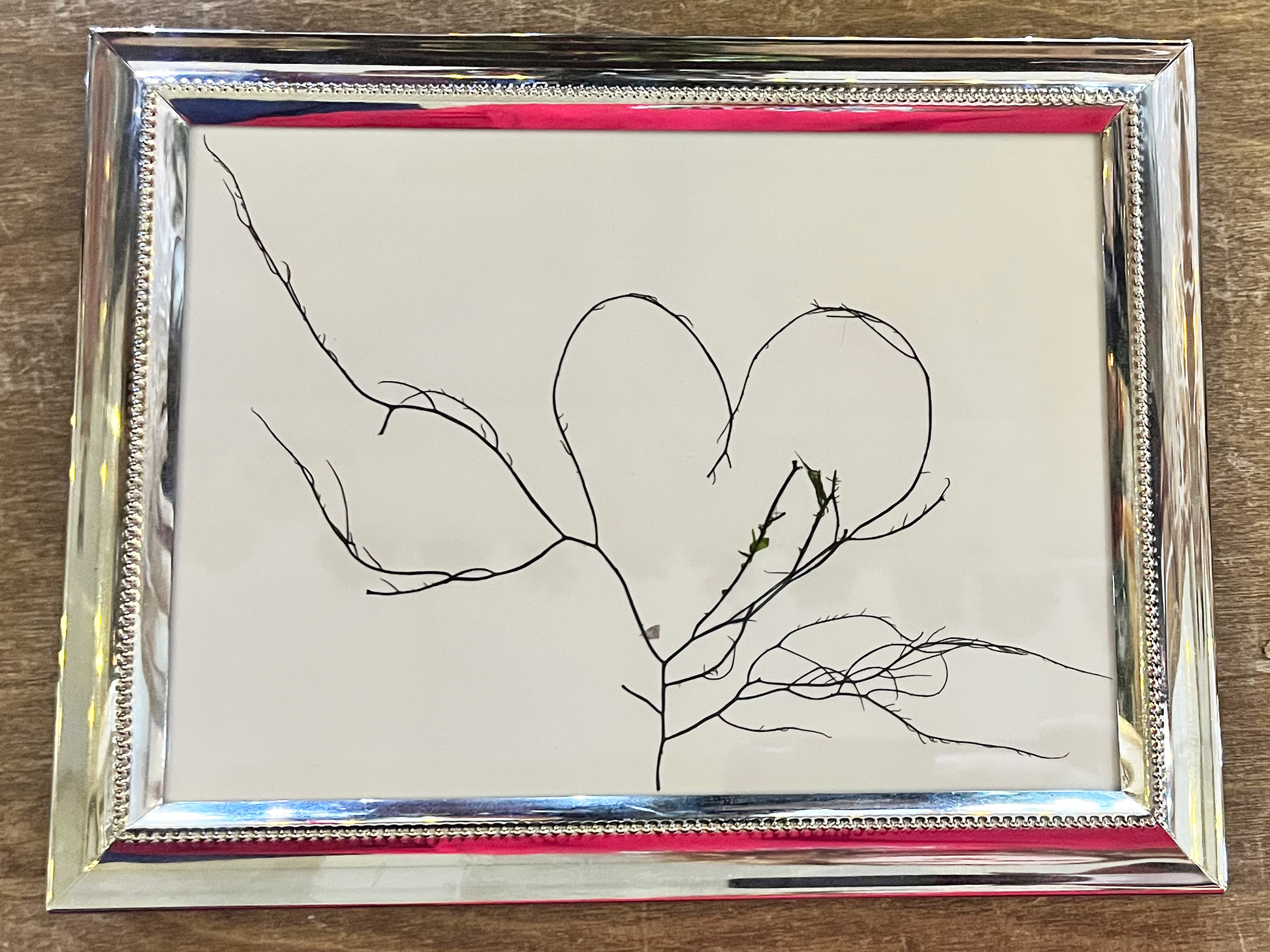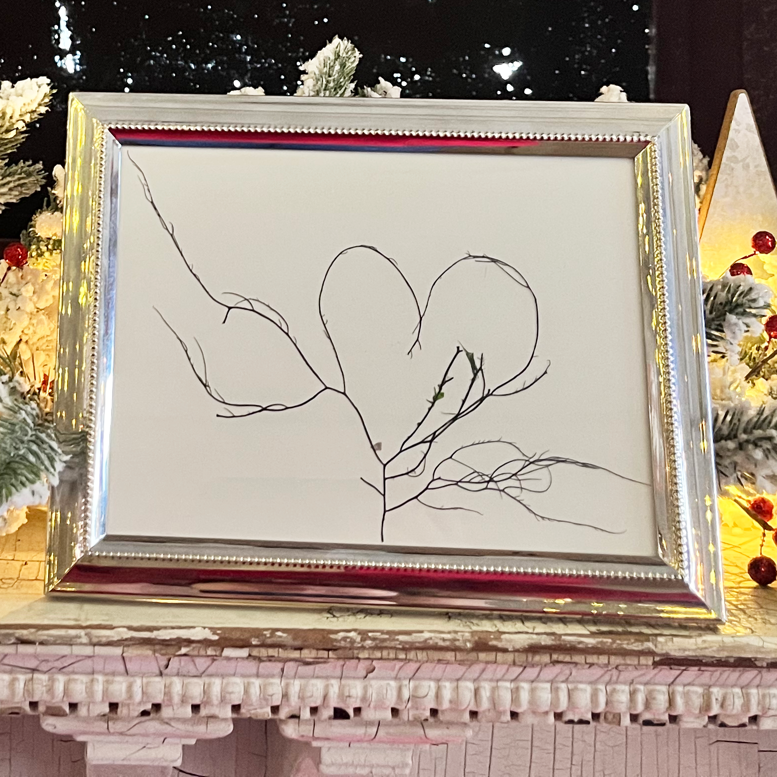 This black branching algae is shaped into a single heart framed by the natural whisps and details of the algae itself. The entire piece is housed in a 5x7 silver frame that sits perfectly on any shelf or flat surface.