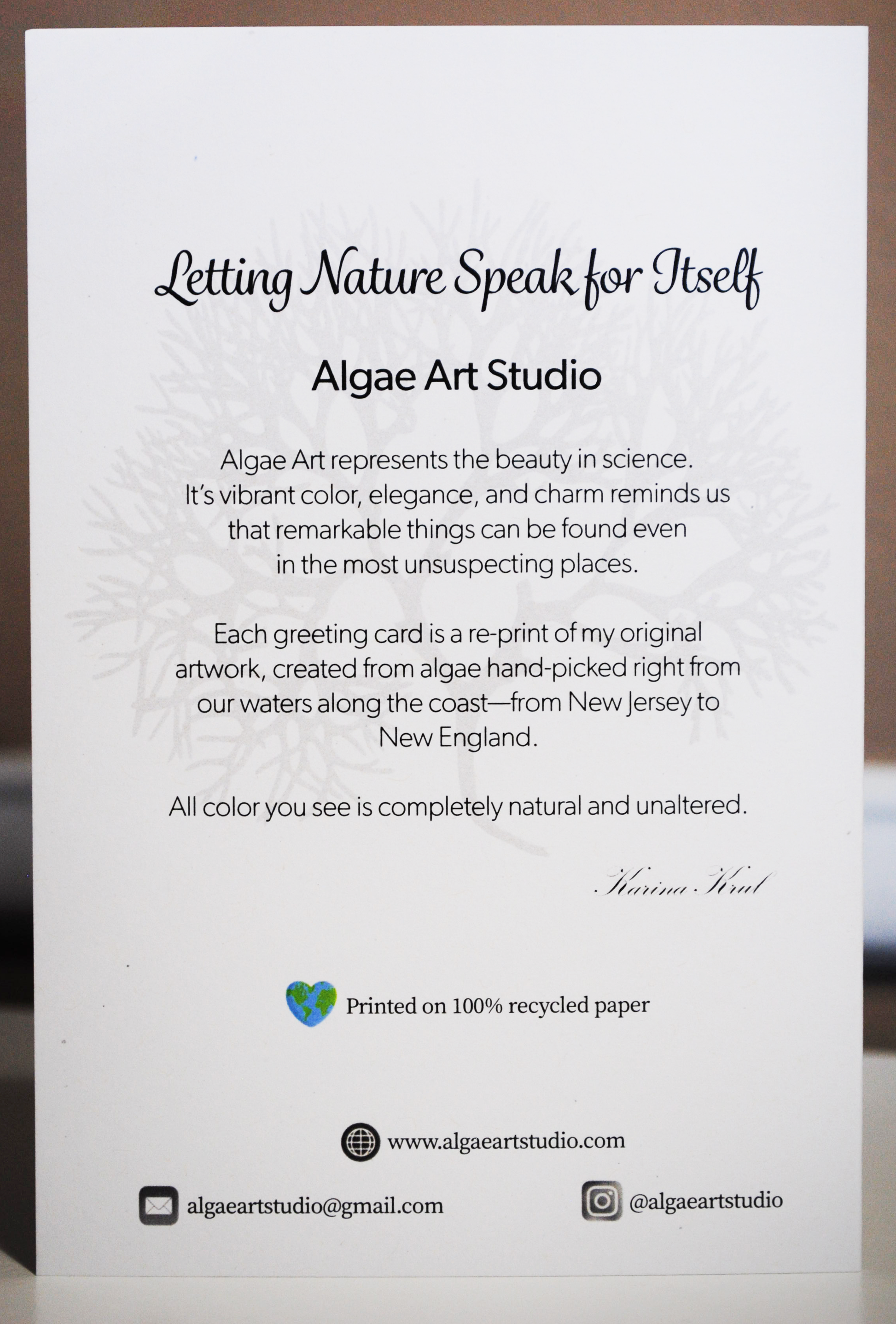 Every design is created using algae that I hand-collect right from our coastline! All framed artwork are original pieces of the pressed algae itself preserved behind the glass. Tote bags, greeting cards, and stickers are re-prints of my original artwork. All color is 100% natural and unaltered.