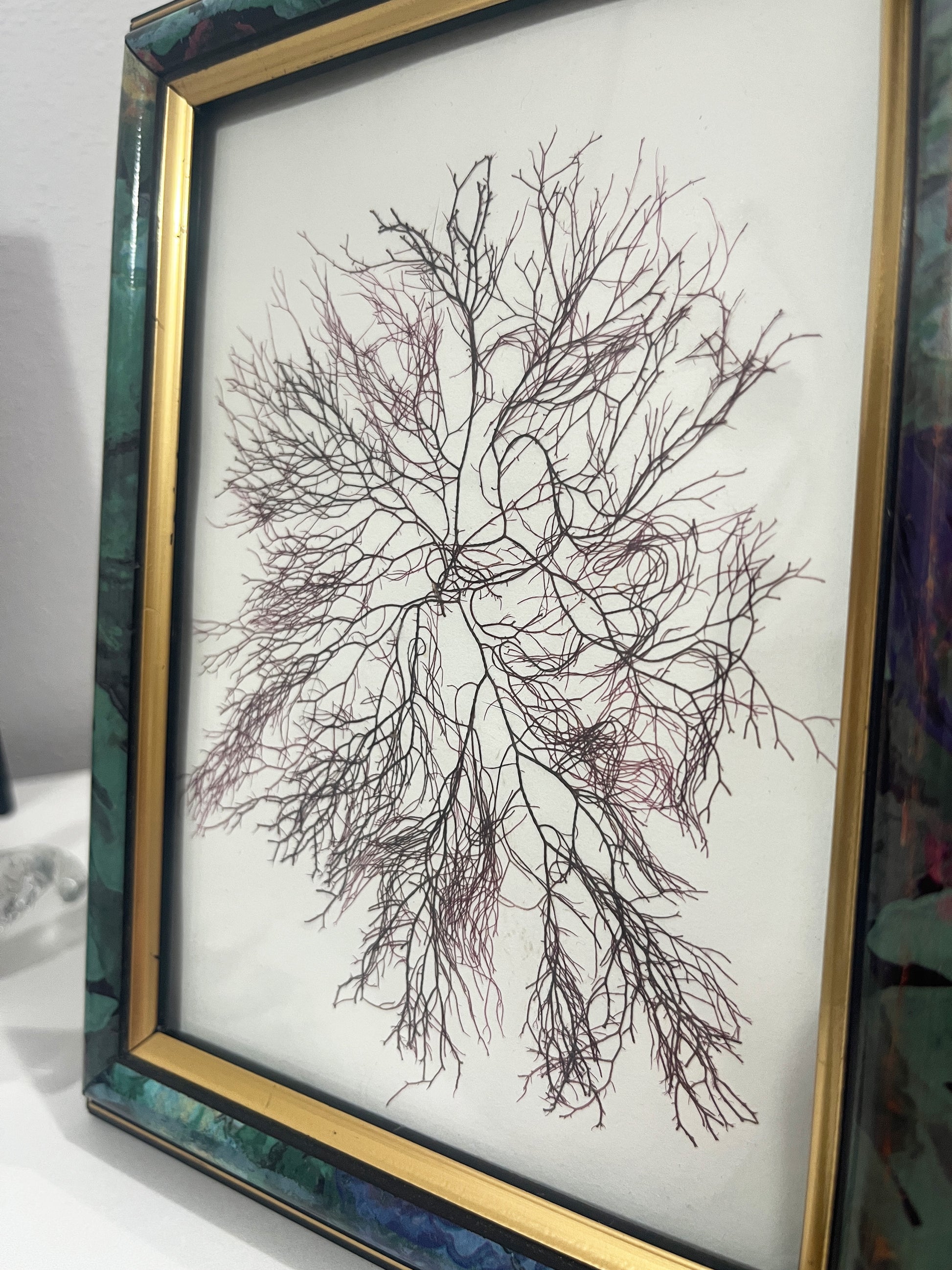 Every design is created using algae that I hand-collect right from our coastline! All framed artwork are original pieces of the pressed algae itself preserved behind the glass. Tote bags, greeting cards, and stickers are re-prints of my original artwork. All color is 100% natural and unaltered.