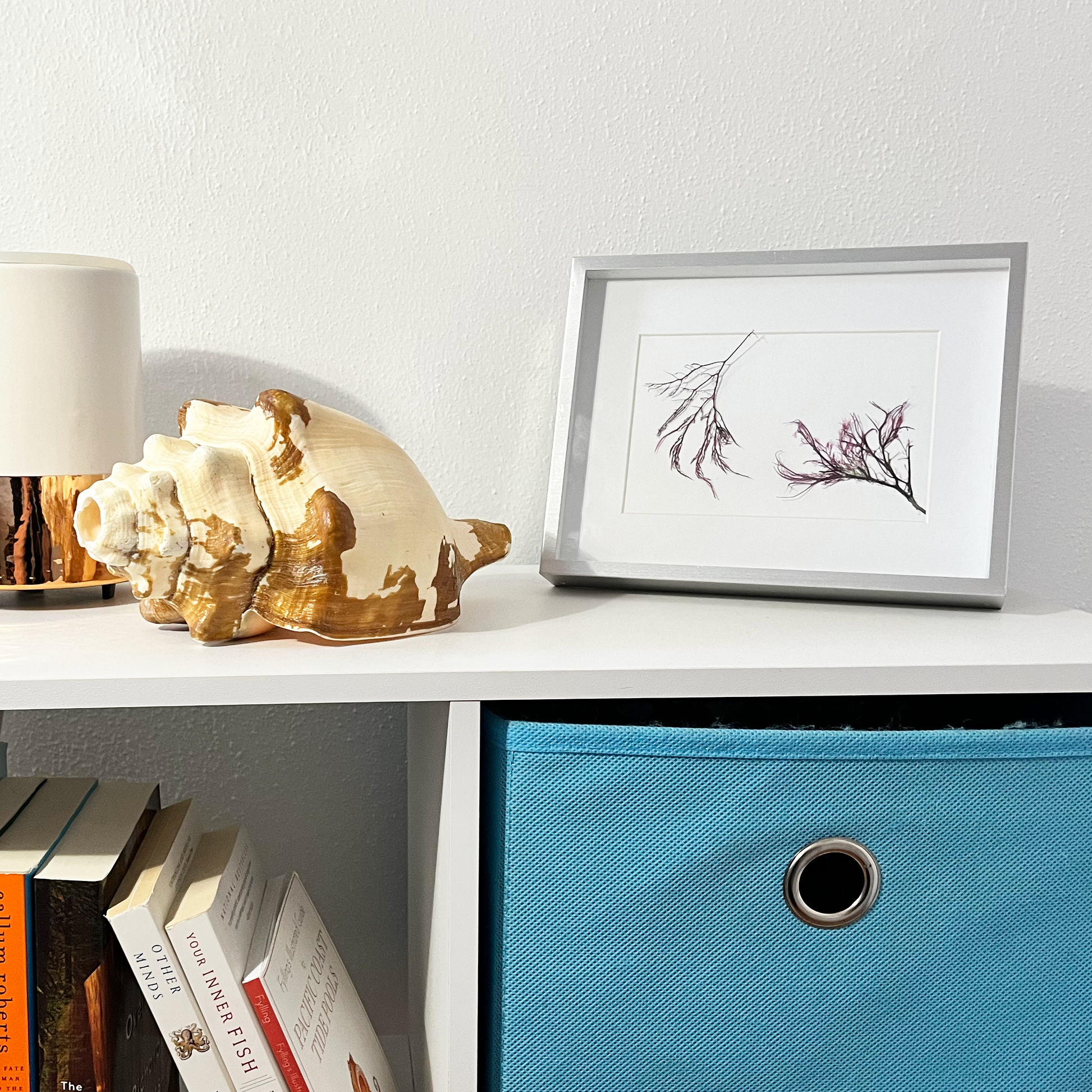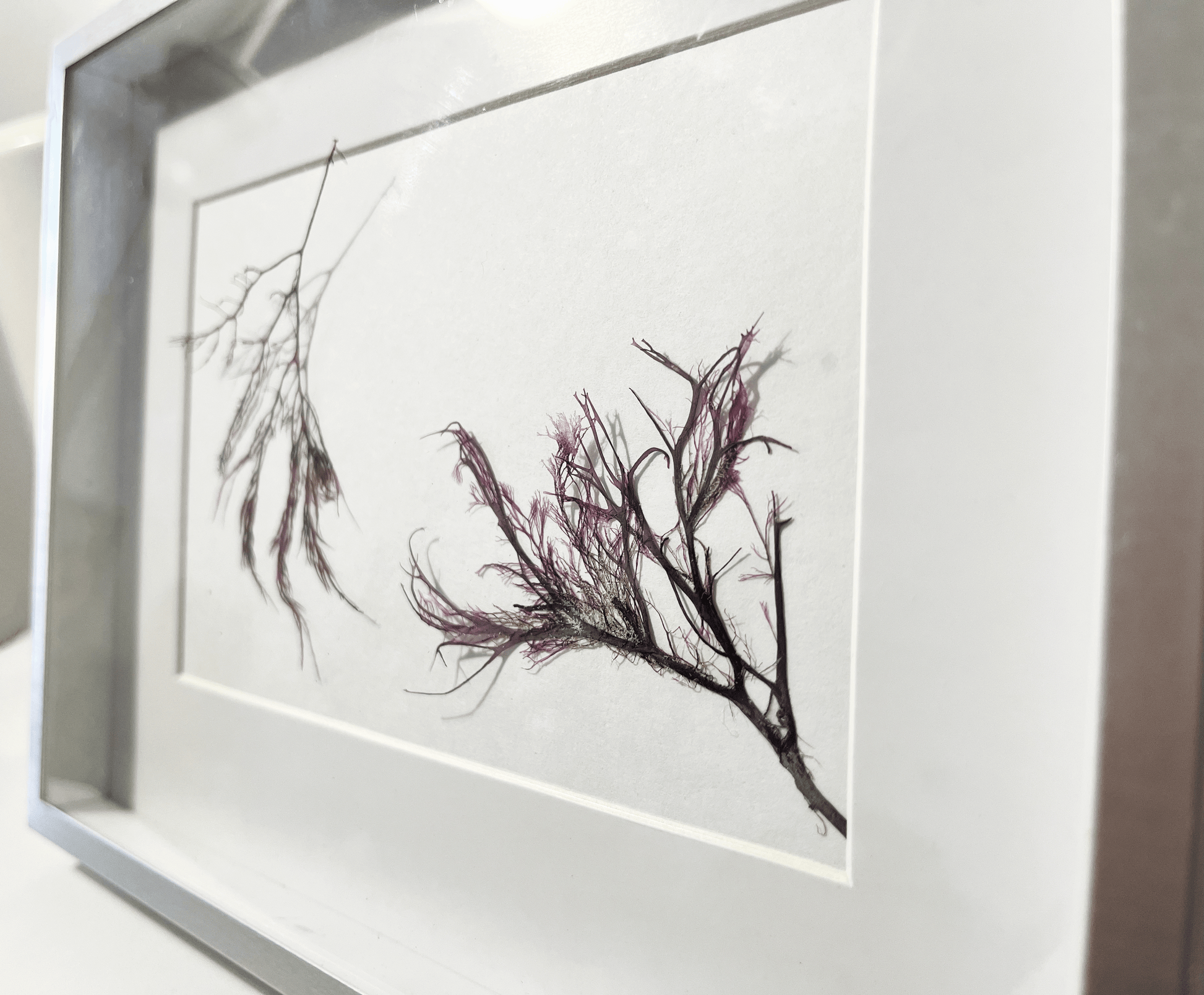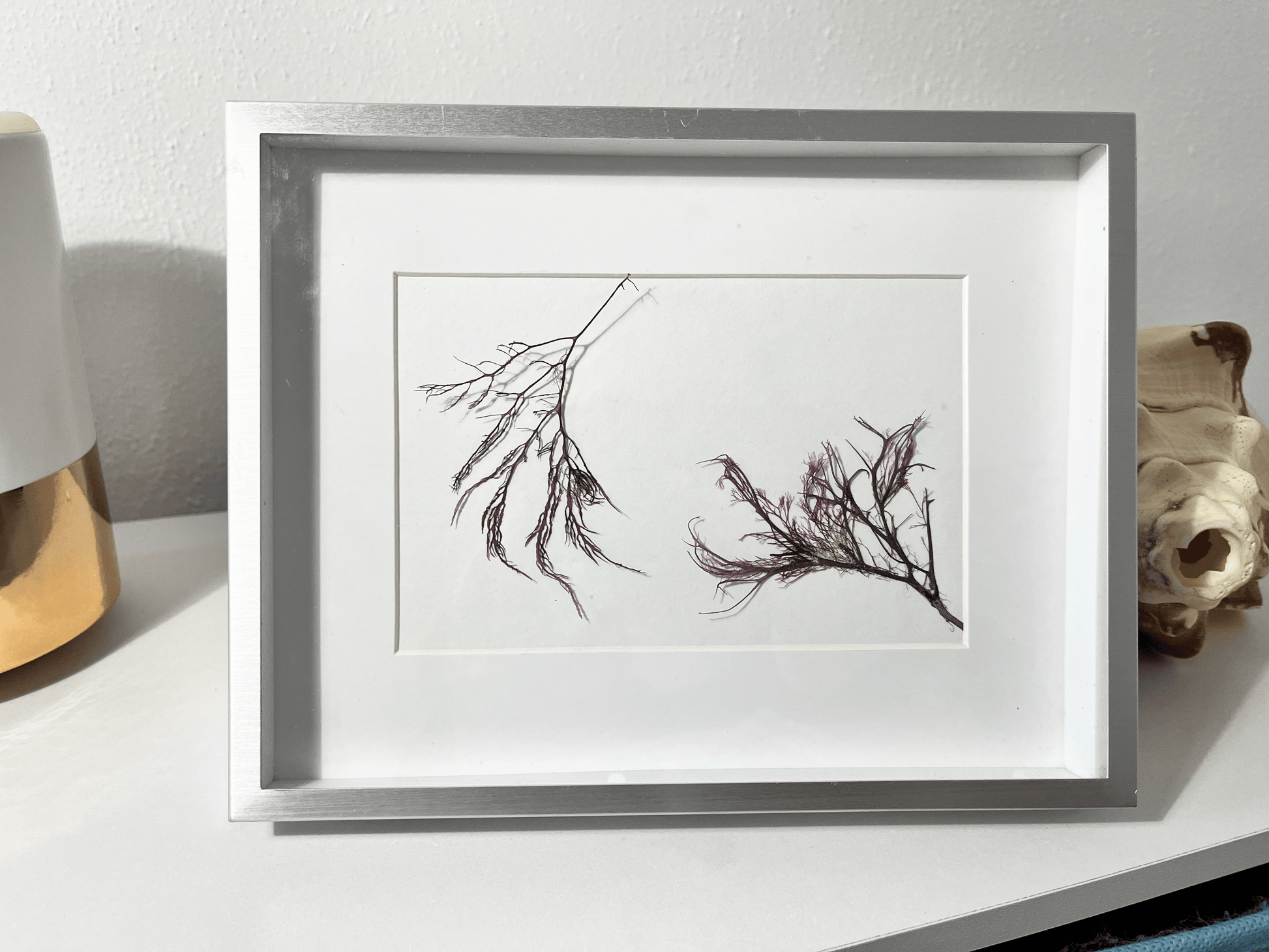 Every design is created using algae that I hand-collect right from our coastline! All framed artwork are original pieces of the pressed algae itself preserved behind the glass. Tote bags, greeting cards, and stickers are re-prints of my original artwork. All color is 100% natural and unaltered.